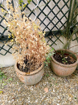 The one containing the Sweet Peas is a write-off for this year: I advised her to cut off that mass of dead stuff and compost it, and then to water the pot in the hopes that the roots would survive - this is Perennial Sweet Pea, I should say, not the annual ones - and with luck, they'd pop up again next year, as normal.