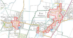 As you can see, West Hanney has one block - edged in red, shaded in pink - of Conservation Area, while East Hanney has one large block, and one little isolated bit.It is quite fascinating, for a rainy day, to find your county's map, and have a look around where you live!